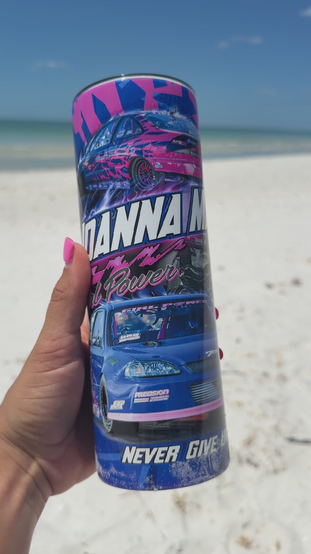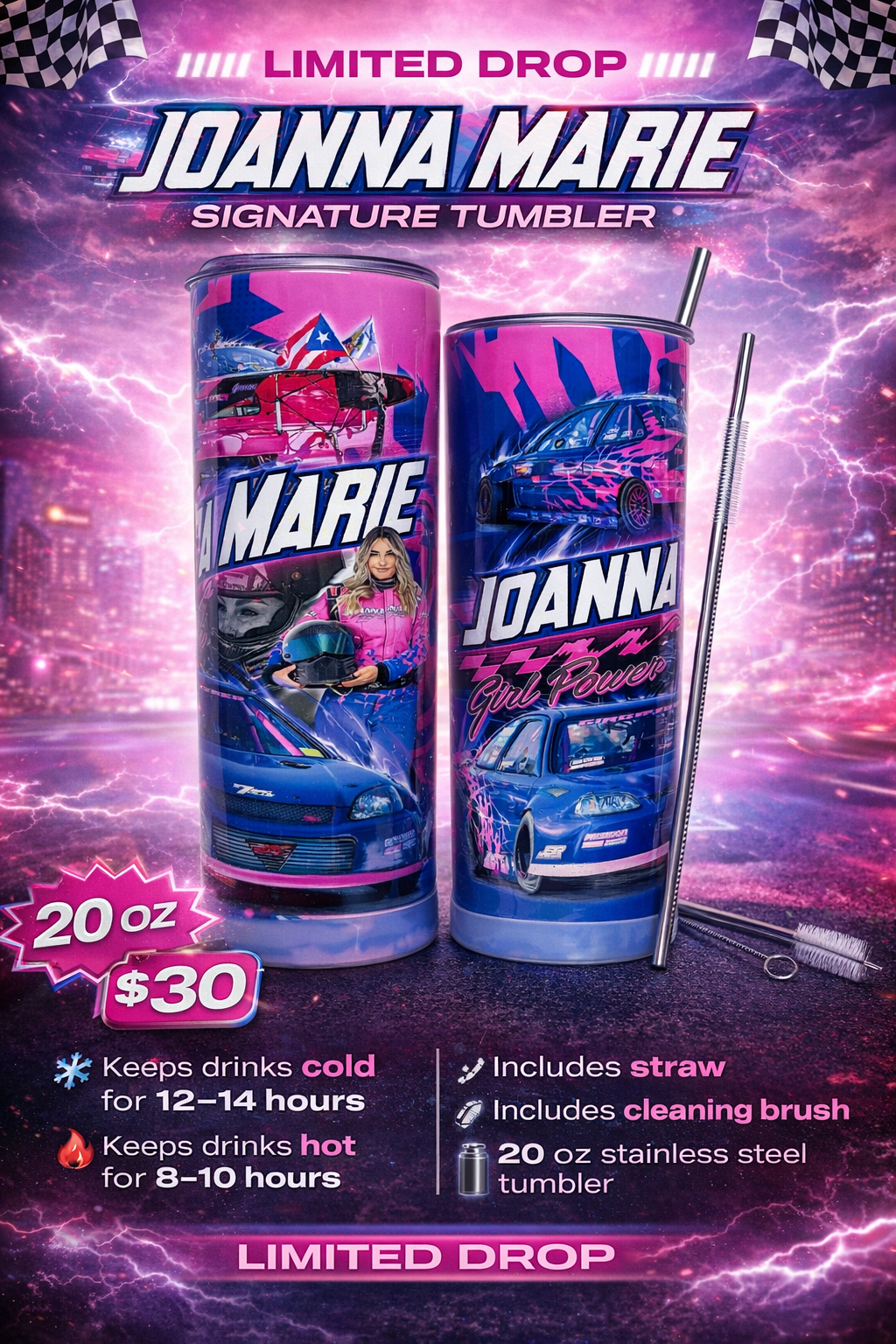 This 20 oz stainless steel tumbler was made for the girls who go hard, stay focused, and never give up. Featuring custom Joanna Marie racing graphics, it’s the perfect cup for race weekends, road trips, gym sessions, and everyday life.